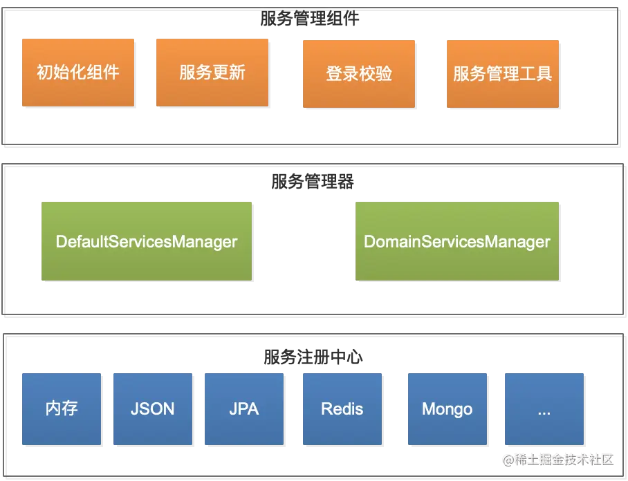 服务管理器负责管理服务注册中心。正是因为有了服务管理器,才实现了服务存储的透明化,使调用方对服务存储方式无感知。也使服务存储更容易扩展,开发者可以根据自己的需求来实现个性化存储。