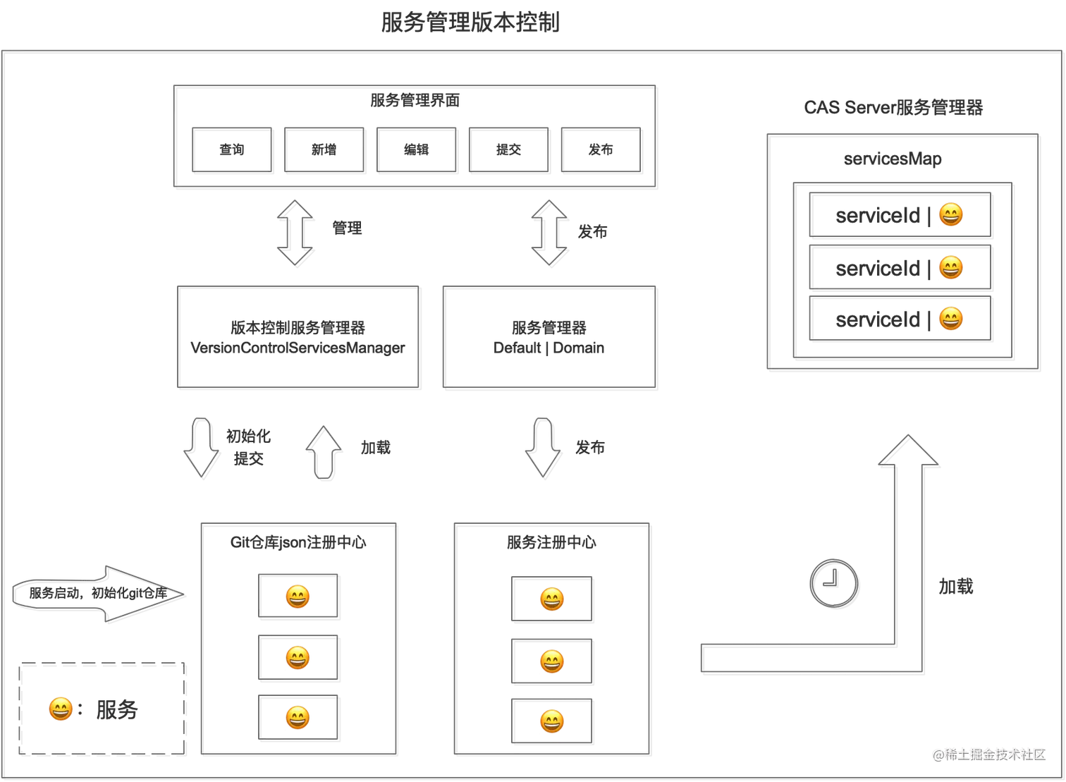 服务的版本控制是通过在本地建立一个git仓库,然后通过操作这个git仓库,发布后同步到CAS Server服务注册中心中,最后通过服务管理的更新机制,同步到CAS Server中。