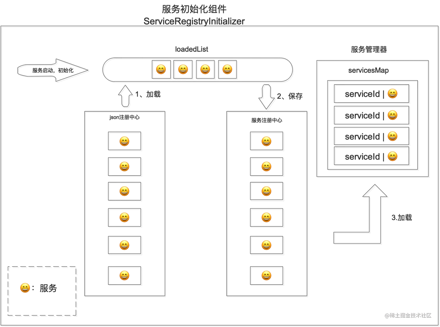 - 服务初始化组件从配置的目录中加载收取服务,并保存到loadedList中;