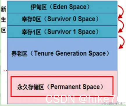永久区perm: 永久存储区是一个常驻内存区域,用于存放JDK自身所携带的 Class,Interface 的元数据,也就是说它存储的是运行环境必须的类信息,被装载进此区域的数据是不会轻易被垃圾回收器回收掉的,关闭 JVM 才会释放此区域所占用的内存。