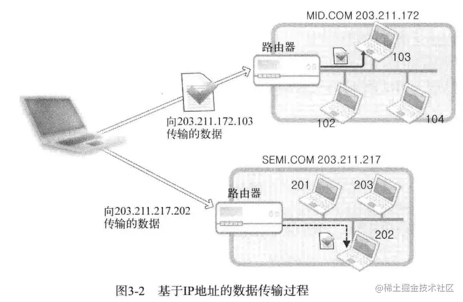 某主机向 203.211.172.103 和 203.211.217.202 传递数据,其中 203.211.172 和 203.211.217 为该网络的网络地址,所以「向相应网络传输数据」实际上是向构成网络的路由器或者交换机传输数据,然后又路由器或者交换机根据数据中的主机地址向目标主机传递数据。