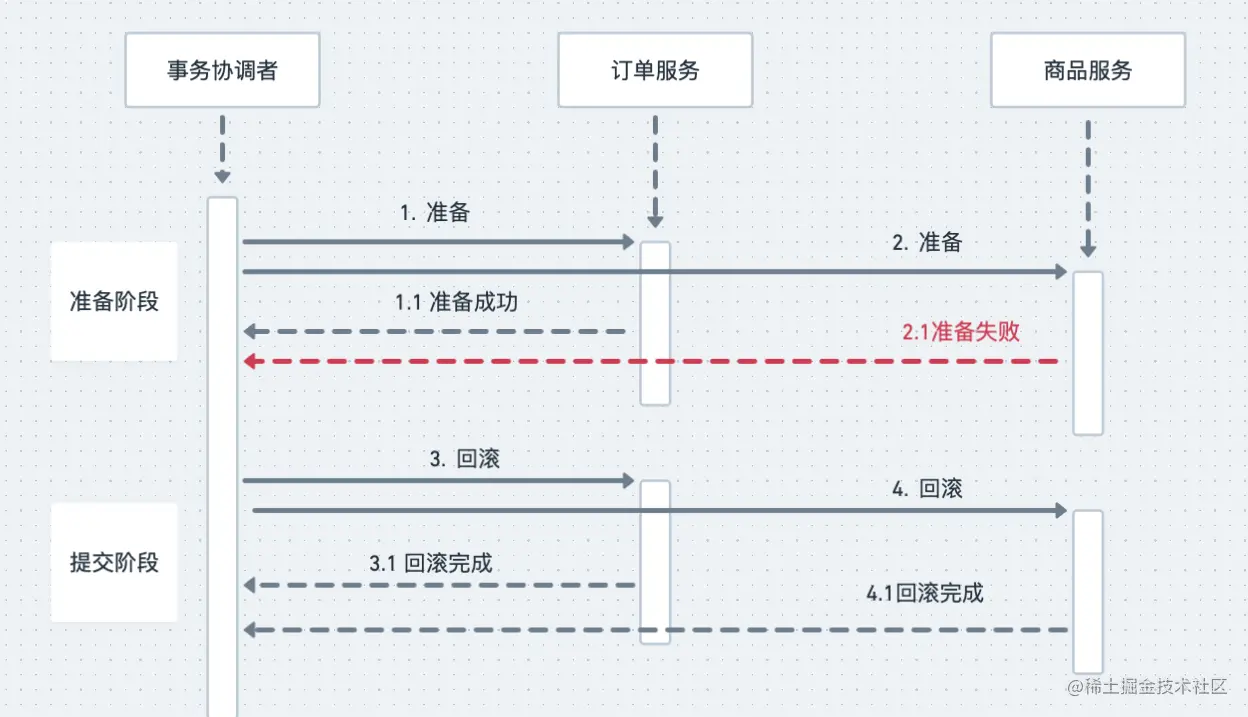 以上是正常情况,接下来才是重点,异常情况怎么办呢?我们还是分两阶段来说明,在准备阶段,如果任何异步出现错误或者超时,协调者就会给两个服务发送回滚事务请求,两个服务在收到请求之后,回滚自己的数据库事务,分布式事务执行失败,两个服务的数据库事务都回滚了,相关的所有数据回滚到分布式事务执行之前的状态,就像这个分布式事务没有执行一样,以下是异常情况的时序图:
