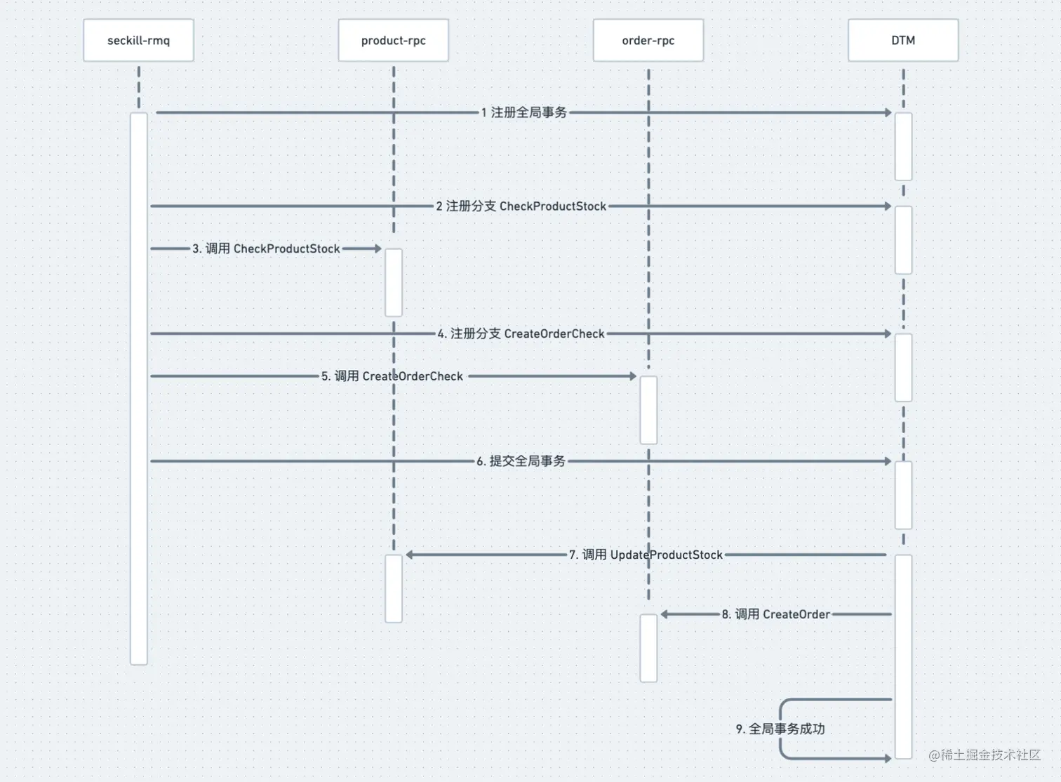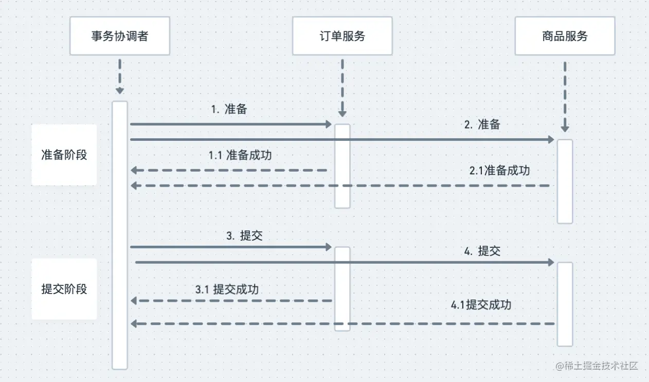 注意这里我们没有提交订单数据库事务,最后给书屋协调者返回准备成功。协调者在收到两个服务准备成功的响应后,开始进入第二阶段。进入提交阶段,提交阶段就比较简单了,协调者再给这两个系统发送提交命令,每个系统提交自己的数据库事务然后给协调者返回提交成功响应,协调者收到有响应之后,给客户端返回成功的响应,整个分布式事务就结束了,以下是这个过程的时序图: