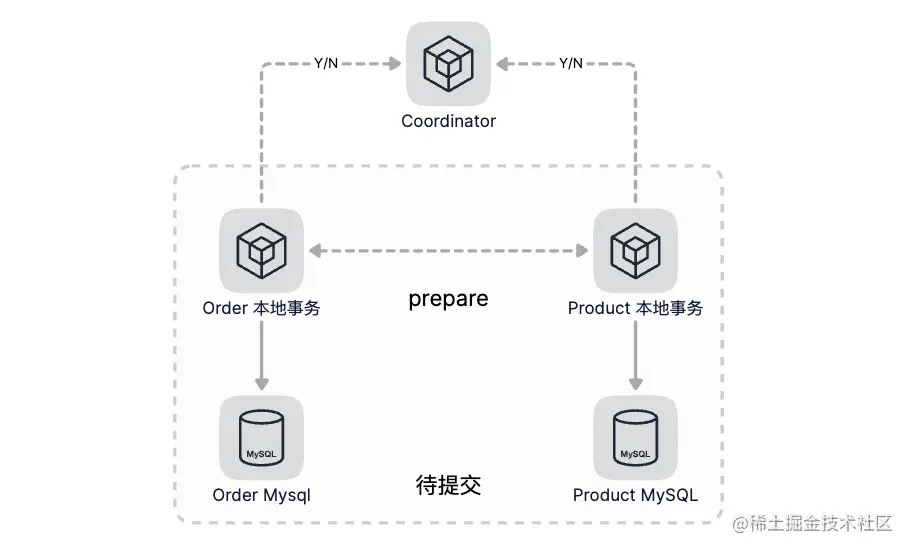 第一步(Prepare):Coordinator向各个分布式事务的参与者下达Prepare指令,各个事务分别将SQL语句在数据库执行但不提交,并且将准备就绪状态上报给Coordinator。