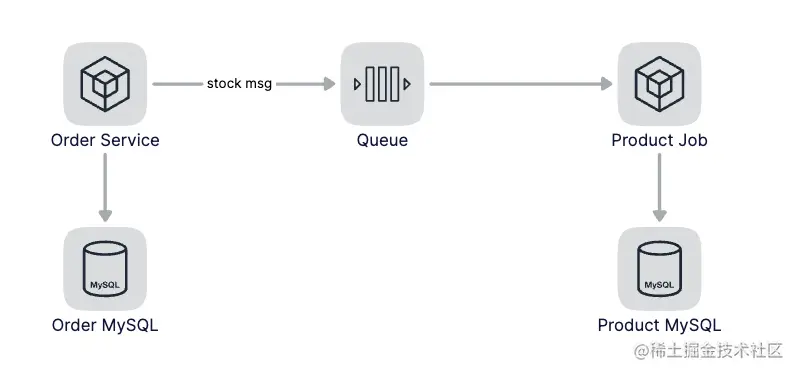 对应到我们的下单操作来说,当用户下单后,我们可以先生成订单,然后发一条扣减库存的消息到消息队列中,这时候订单就算完成,但实际还没有扣减库存,因为库存的扣减和下单操作是异步的,也就是这个时候产生了数据的不一致。当消费到了扣减库存的消息后进行库存扣减操作,这个时候数据实现了最终一致性。