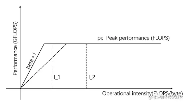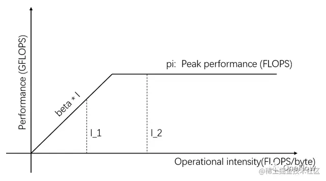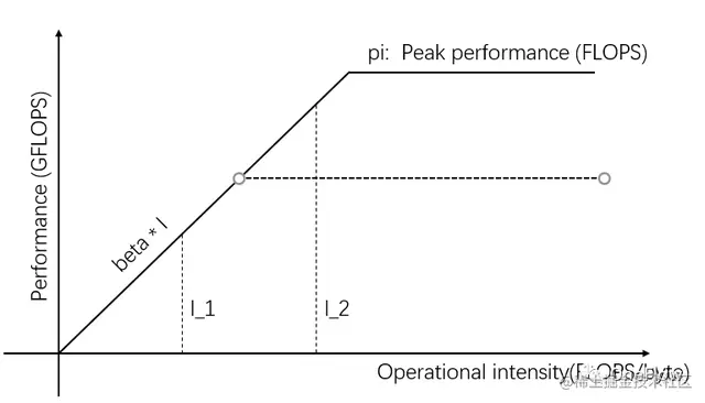 图1横轴的自变量表示不同任务的运算强度,即每字节需要的浮点运算次数。纵轴的因变量表示实际可达的计算性能,即每秒钟执行的浮点运算次数。上图展示了两个运算强度分别为I_1和I_2的任务能实际达到的计算性能,I_1的运算强度小于pi/beta,称为访存受限任务,实际计算性能beta * I_1低于理论峰值pi。