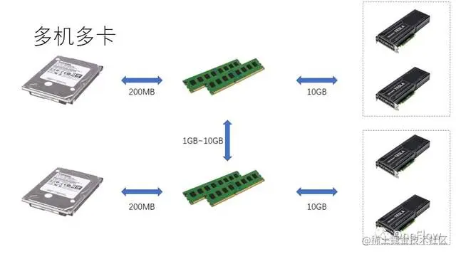 多机多卡场景,GPU之间数据搬运的复杂性进一步提高,机器之间通过网络搬运数据的带宽一般低于机器内部通过PCIe搬运数据的带宽,这意味着并行度提高了,可数据搬运带宽降低了,代表着Roofline model中斜线的斜率变小了,CNN这种适合数据并行的场景通常意味着比较高的运算强度I,而还有一些模型譬如RNN/LSTM,运算强度I就小很多,这也意味着流水线中的通信开销更难以掩盖了。