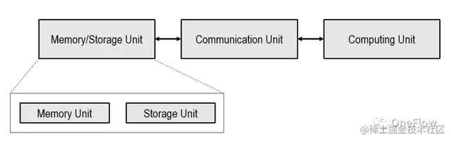 如果Computing Unit是专用芯片,通常只有数据存储在Memory Unit。Communication Unit负责把数据从Memory Unit搬运给Computing Unit,完成数据加载(load),Computing Unit拿到数据后负责完成计算(数据的形式转换),再由Communication Unit把计算结果搬运到Memory Unit完成数据存储(Store)。
