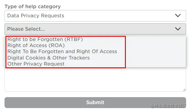 接下来进入 问题详情 部分,如果你想删除你的账户,首先选择你的设备,然后在发送账户删除请求的旁边选择数据隐私请求的选项。之后,选择任何一个适当的选项,如下图所示。