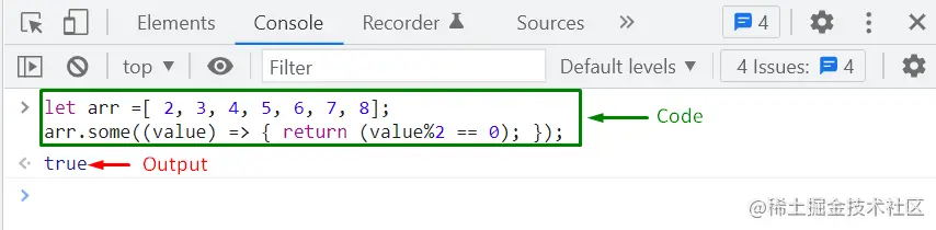 接下来,我们将使用some() 方法来检查数组中是否有至少或多于一个偶数元素 。