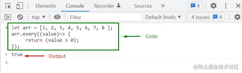 我们传递给every() 方法的给定数组 有正值 ,所以条件 得到满足 ,输出将为真,否则,如果给定条件没有得到满足,它将返回假的输出。