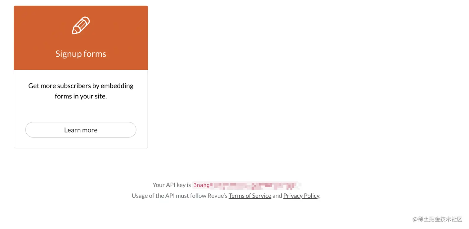 调用接口需要申请。正常的情况下,你应该在 www.getrevue.co/app/integra… 这个页面的底部申请。申请通过后,你会得到如下的一串 api_key: