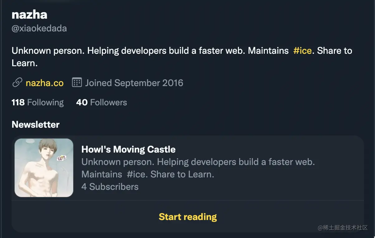 Revue 是一个提供 Newsletter 的服务平台,在 2021 年被 Twitter 公司收购。如果喜欢逛 Twitter 的用户,有时候可能可以看到某个用户主页会展示 Newsletter 订阅,其背后就是 Revue 提供的服务,比如我的主页。