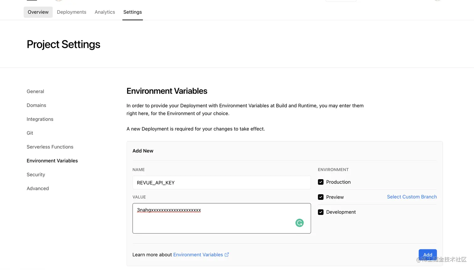 对于生产环境需要使用 api_key,就需要在部署或运行时添加环境环境变量。比如使用 vercel 进行发布的时候,就可以如下配置: