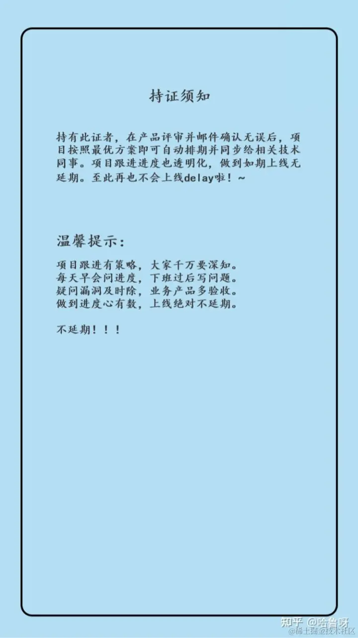项目跟进的及时,可能会有提前上线的可能,否则项目很容易延期。(PS:相信产品经理都有延期恐惧症)预知风险及时消除是产品经理在项目管理中的必修课。再一点想要告知产品经理:如果有了第一次延期,接下来在产品迭代中会有无数次延期。(请一定要看看温馨提示,辛苦了。)
