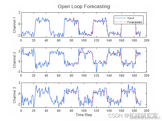 - 开环预测仅使用输入数据预测序列中的下一个时间步长。在对后续时间步进行预测时,您会从数据源中收集真实值并将其用作输入。