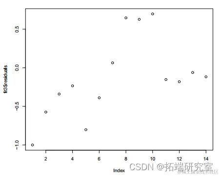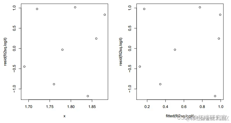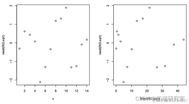 拟合模型的残差 y = (-0.27571 +0.49277x)2 + e 显示出更加随机的模式。12 df 上的偏差 16.905 略高于之前模型的 16.371(df=11),但仍然不显着(P 值=0.1532>0.10)。AIC 较小,为 73.833<75.298。因此,具有平方根链接的模型是首选。