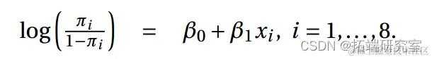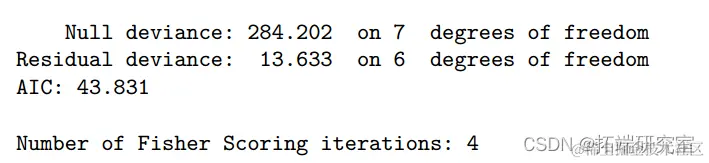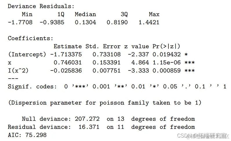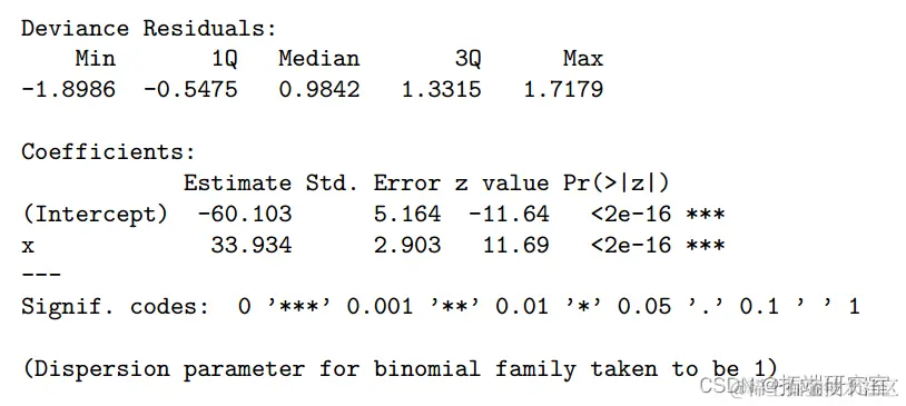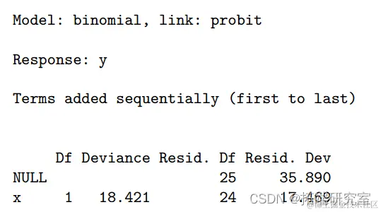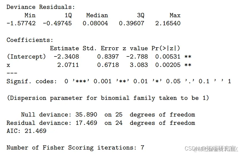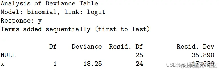 空模型不包含预测变量,在 25 个自由度 (df) 上的偏差为 35.89。当协变量 x 添加到空模型时,偏差的变化是 35.890-17.639=18.25。与自由度为 25-24=1 的卡方分布相比,其 P 值为 1.93 × 10 -5 非常显着。