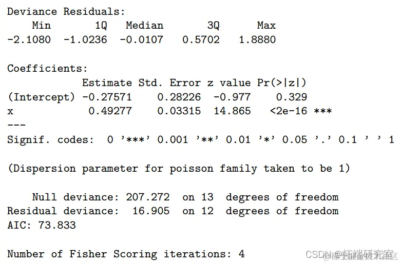 a) 我们输入数据并使用默认对数链接拟合泊松回归模型。