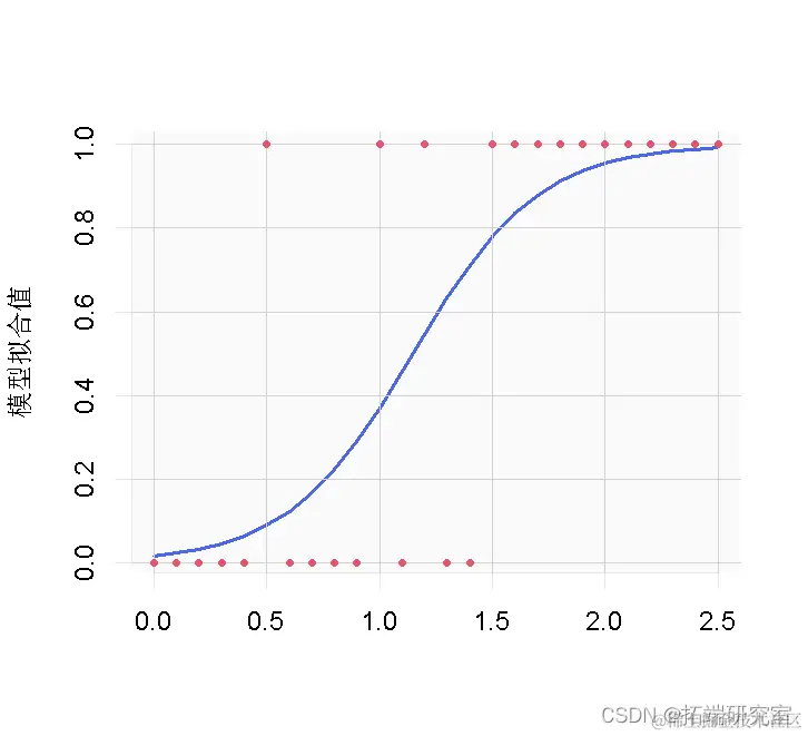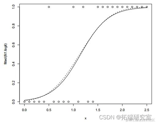 图 1:逻辑回归的小鼠数据和拟合值。