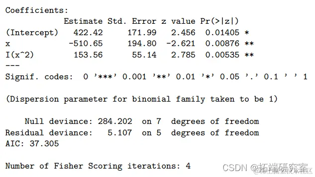 并且所有参数估计值都很显着(5%)。对数几率以二次方式依赖于 x。