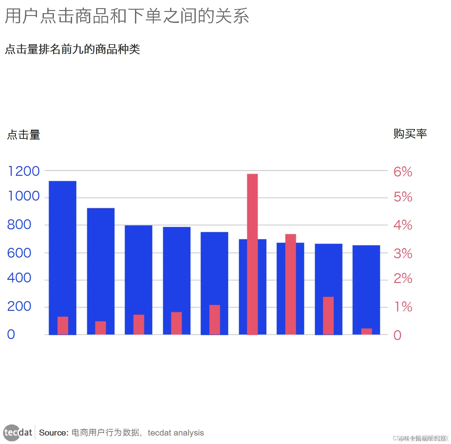 对点击进行排序后,分析最畅销的商品,找出点击与购买之间的关系。 从上图我们可以看出,点击率最高的产品的购买率只有0.56%,而点击率第6的产品的购买率已经达到了5.8%。