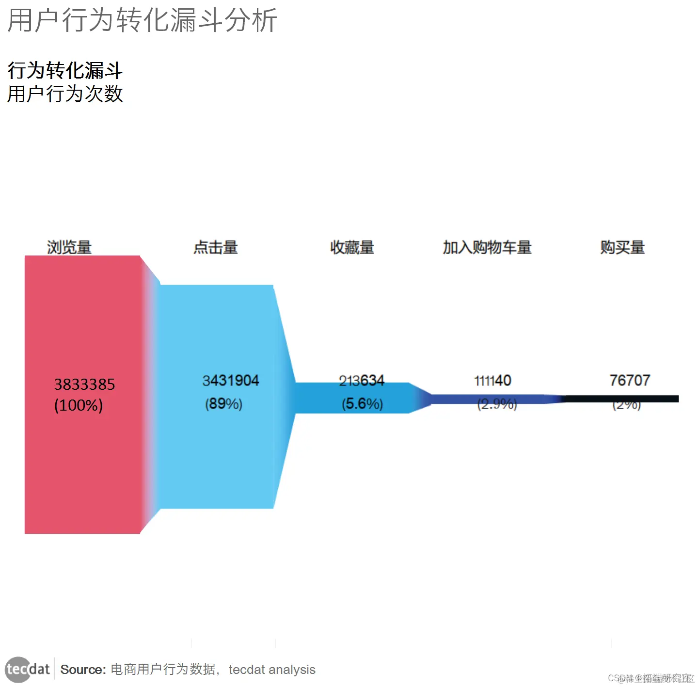 从上面的漏斗图分析可以看出,从用户进入APP浏览页面开始,购买环节的最终转化率为2%。 用户点击页面后,用户流失巨大。 从浏览到购买的转化率是多少?
