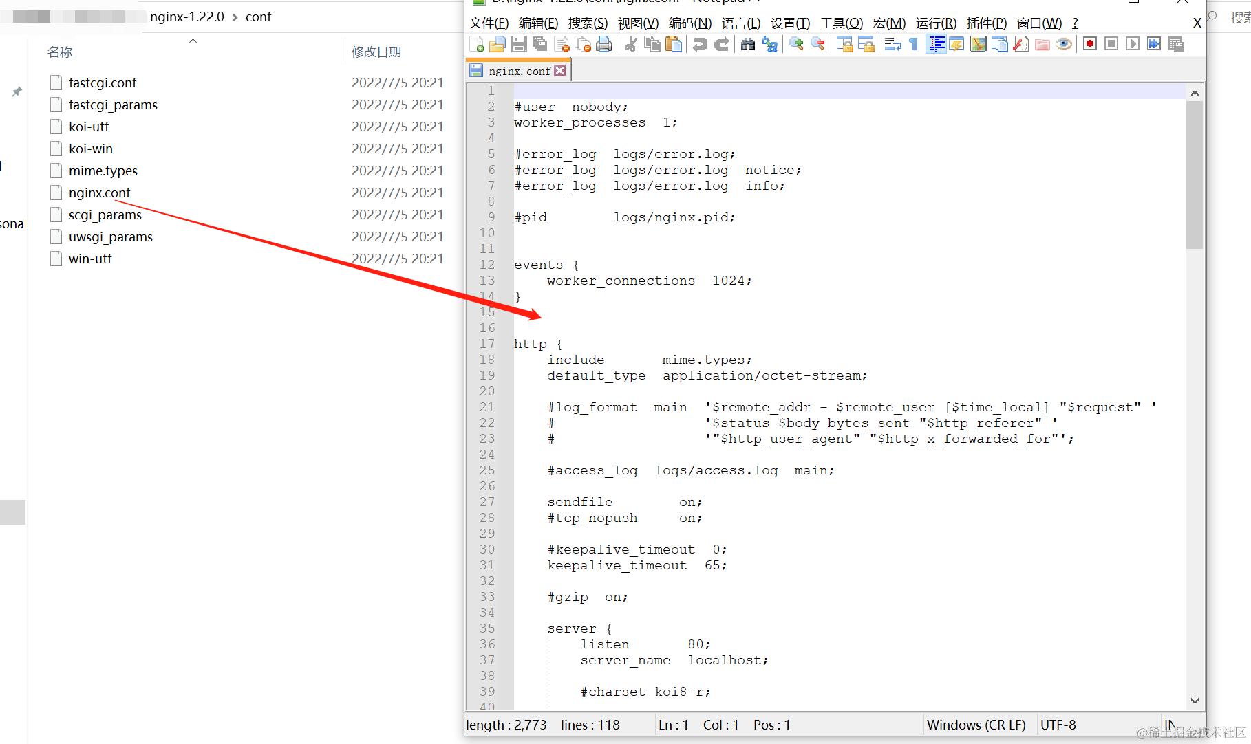 D:\nginx-1.22.0\conf\nginx.conf配置文件,对应配置如下,比较简单: