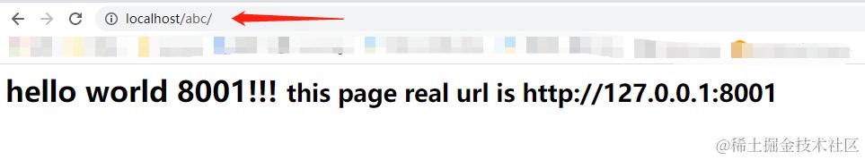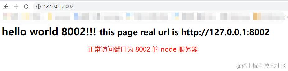node服务模拟不同的服务器,如下:// server-abc.js const express = require('express'); const app = express(); app.get('/',(req, res,next)=>{ res.end(`<h1>hello world 8001!!! <small>this page real url is http://127.0.0.1:8001</small></h1>`); }); app.listen(8001, (err) => { if(err) { console.log("server run with error!!"); return } console.log("server is runing at:http://127.0.0.1:8001"); }); // server-xyz.js const express = require('express'); const app = express(); app.get('/',(req, res,next)=>{ res.end(`<h1>hello world 8002!!! <small>this page real url is http://127.0.0.1:8002</small></h1>`); }); app.listen(8002, (err) => { if(err) { console.log("server run with error!!"); return } console.log("server is runing at:http://127.0.0.1:8002"); });