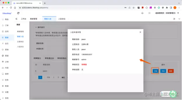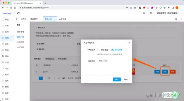通过在商城端预留提交申请的表单入口,到平台端审核商家入驻的申请,从而实现了商家开店闭环。