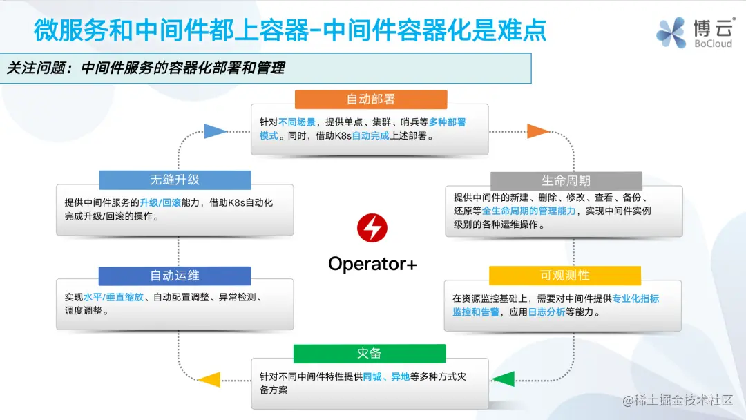 刚刚有讲过,在微服务和中间件都上容器的场景,除了网络选型,还有一个重点关注的内容,就是中间件的容器化。例如 MySQL、Redis、Kafka、Nacos 之类,这些中间件不光需要考虑怎么容器化部署,还要进行包括全生命周期管理、可观测性、灾备、自动运维和无缝升级等中间件管理能力的建设。