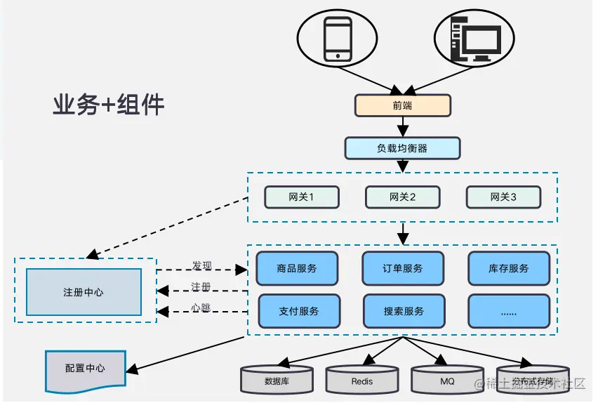 基于这些变化,我们可能会产生一些疑惑和不确定性。例如,如果是某某框架自研或采购的某某厂商的微服务应用,能上容器吗?好上容器吗?会不会很麻烦?带来哪些问题?注册是 nacos,或者是用到了某某组件、中间件,影响上容器吗?带着这些问题,我们先基于一个典型的微服务架构应用来看一下。
