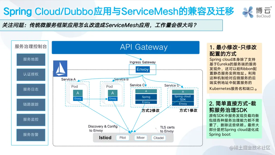 一种比较好理解,就是裁剪掉服务治理 SDK;另一种比较保守的方式是只修改配置,SDK 依然保留,但实际保留的主要是代码框架、应用协议等开发功能,涉及到微服务治理的内容都卸载到基础设施去做。这需要原来的注册中心,治理等相关功能要借助 Kubernetes 和 ServiceMesh 去做,包括注册中心使用 kubernetes service 能力,直接使用 kubernetes 的服务名和端口访问目标服务,结合自身需求,使用网格中的治理能力来逐步替换原有的相关能力。