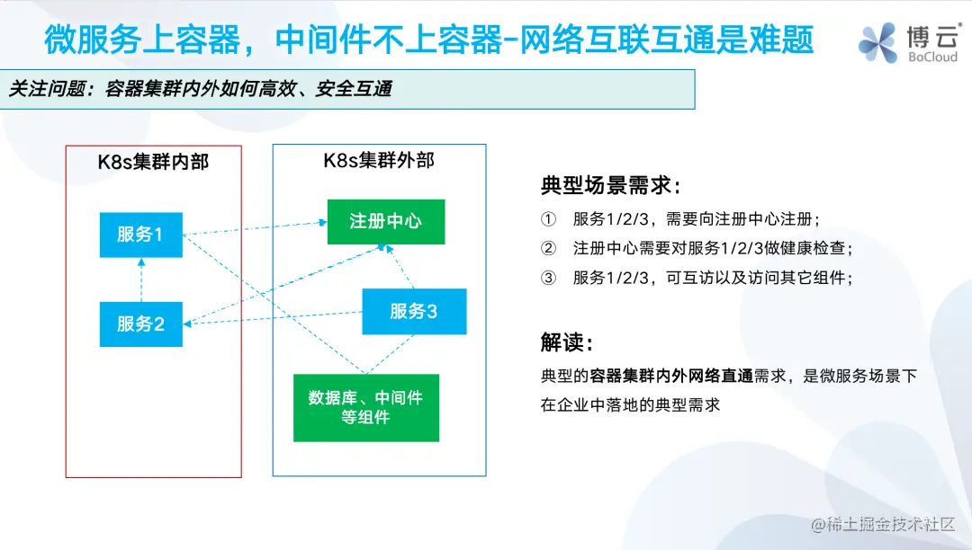 那么对于注册中心来说,它希望各个服务还是像以前虚拟机部署一样去做注册,网络直通,同时服务对于数据库中间件的访问性能不要降低。这其实是对容器集群的网络方案提出了更高的要求。