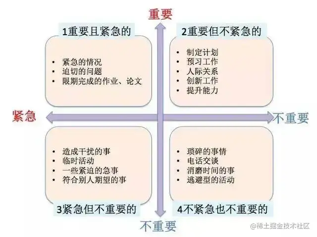 学会工作授权不仅仅是leader要做的,普通的一线程序员也要有这个意识,否则会被大量紧急不重要或者不紧急也不重要的事情缠身,效率也不可能高。