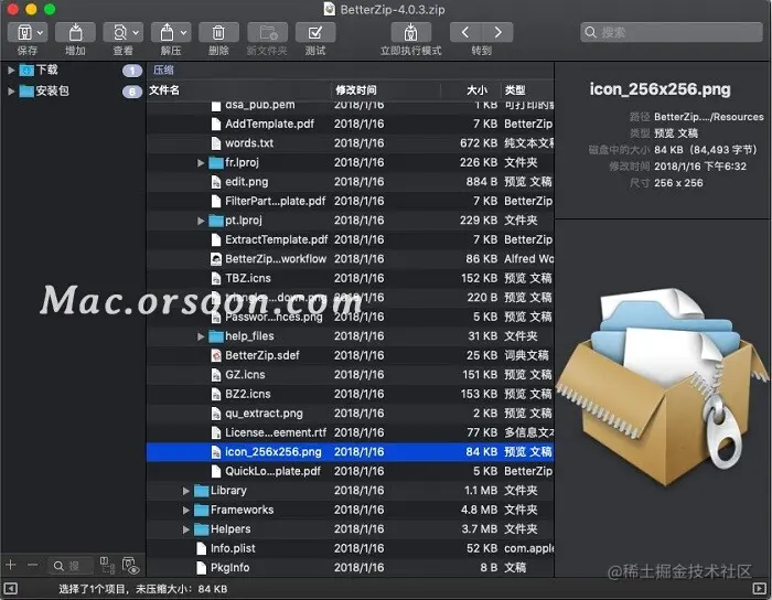 如图4所示的功能并不是BeteerZip的独家亮点,实际上,很多压缩软件都已经可以不需要压缩直接读取压缩包内的内容了,包括WinRAR在内的诸多软件也可以。那为什么还要提这一点,因为BetterZip的直接读取速度非常快,而且内容详情显示预览也非常清晰,这就是为什么首推BetterZip的原因了。