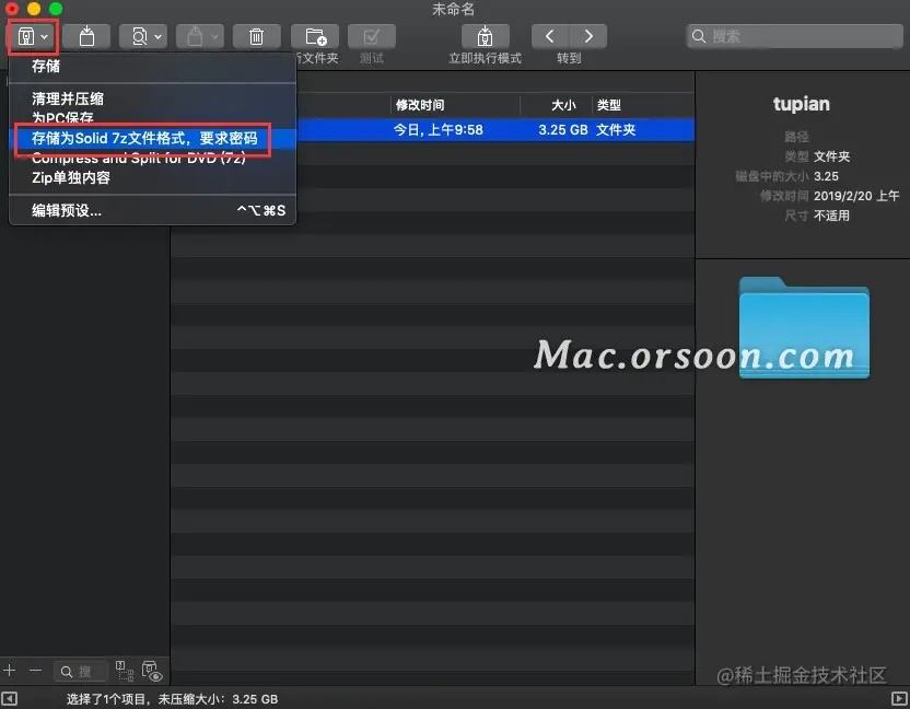2、选中该文件,然后选中【保存】按钮的下拉按钮,在下拉列表中选择【存储为Solid 7z文件格式,要求密码】,如果你不确定哪个选项是加密的,那么可以在【保存】中进行查看,路径:【BetterZip】>【首选项】>【预置】;