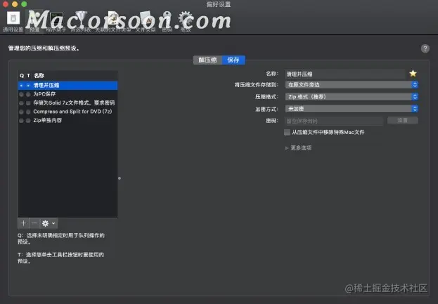 按照以上操作过后我们就可以给这个压缩包设置密码了,如果在预置中没有加密的选项,我们可以在进行压缩操作前添加保存预置。