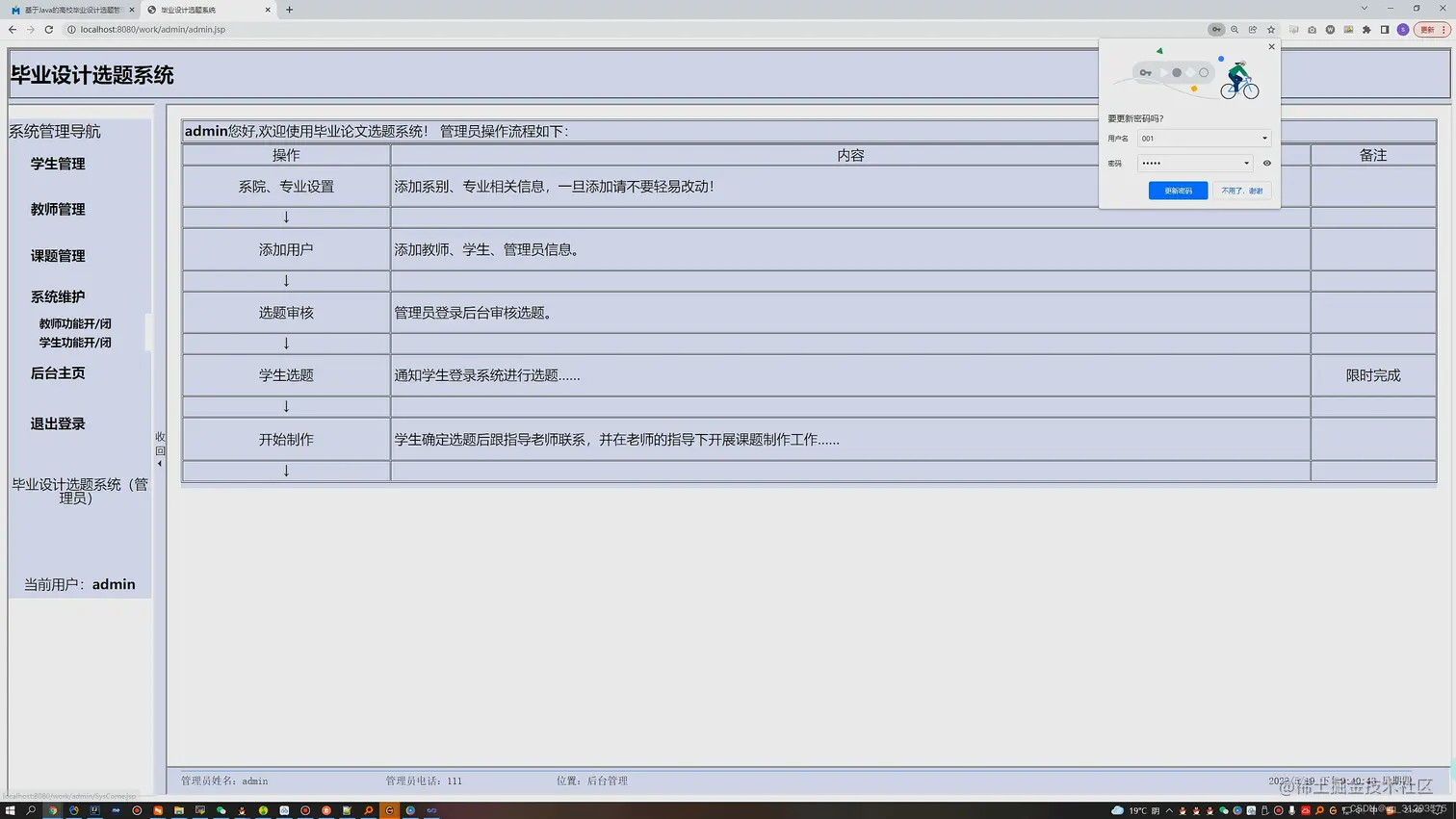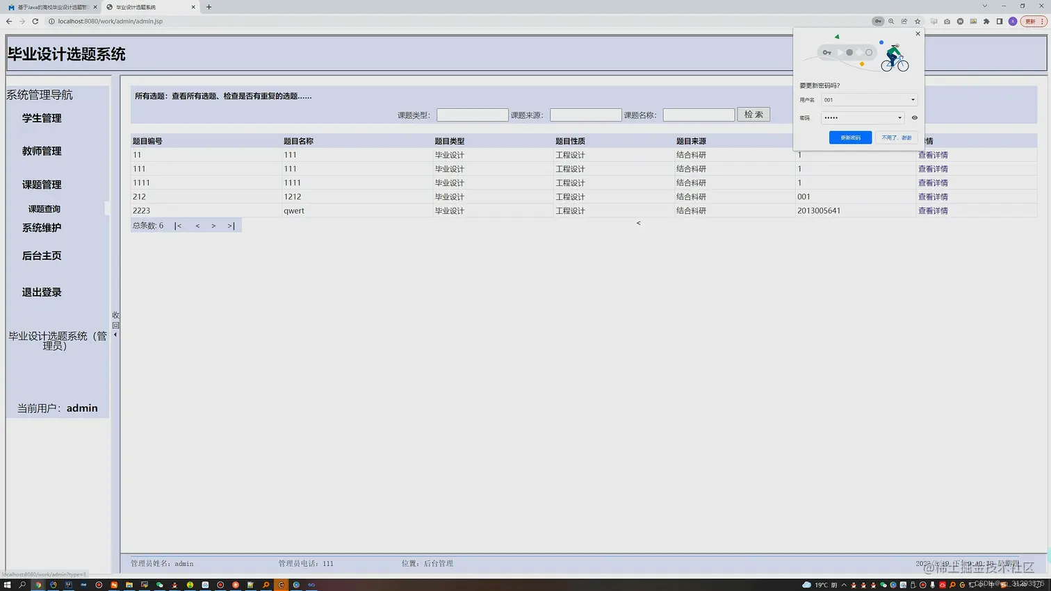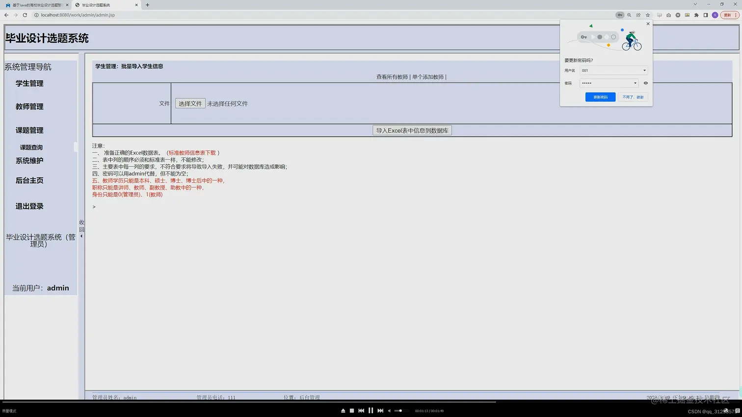2. 管理员虽然也是一个角色,但是是个特殊的用户,其实在数据库中也是由教师信息表来维护,只不过有一个字段是专门来识别是否是管理员。管理员可以注册教师和学生的信息,同时支持Excel表批量注册,只要上传的Excel工作表符合规范要求即可。同时系统提供规范的工作表给管理员下载。 - 普通用户分为学生角色和教师角色,基本功能都提供了修改个人信息以及密码,学生可以选择、修改、退选课题,老师可以创建、修改、删除课题。课题连接学生和教师的关系,双方可以通过课题来查看对方的信息。
