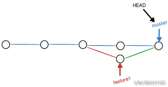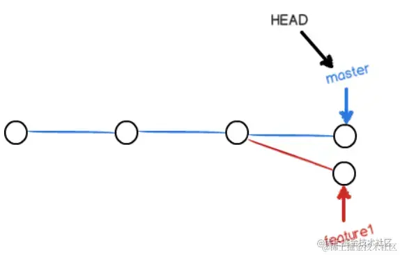 此时,master分支和feature1分支各自都分别有新的提交,变成了下图所示:
