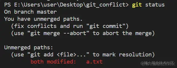 从冲突信息可以看到,a.txt发生冲突,必须手动解决冲突之后再提交