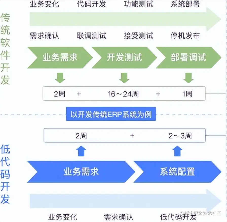 传统软件开发要经历业务需求、开发测试和部署发布三个大环节,复杂系统动辄需要一个团队半年以上的时间,对于一些需求不能灵敏变更。