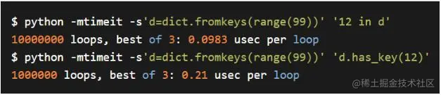 当谈到Python 3时,我们必须注意到 has_key() 方法已经被删除,所以我们肯定要使用in操作符。现在谈到Python 2,使用in操作符更有效,也更符合Pythonic,即in操作符的性能相当高。