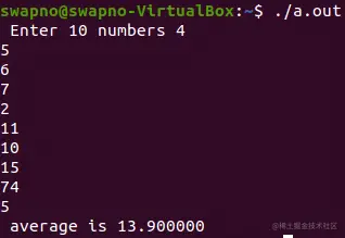 这里我们声明了一个名为a[]的数组,它容纳了10个值。在for循环 的帮助下**,** 我们添加了一些数值,这些数值将使用scanf()函数从用户那里获取。然后,我们计算这10个值的平均值,并将其存储在avg 变量中。