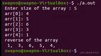 这里我们用动态内存分配的方法创建一个数组。Malloc()函数创建了数组的块,并动态地获得一些值。然后,我们将这些数组的值反转并打印出来。
