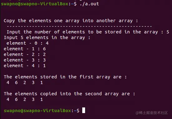 这里我们声明了一个名为a [] 的数组**。** 在这个数组中,我们从用户那里获取一些值。现在我们又声明了一个名为b [] 的数组。数组b[]的元素是从数组a[]的元素中复制出来的,并将这些值同时打印给数组a[]和b[]。我们可以看到产生了相同的输出,因为它们是复制的版本。