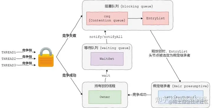 synchronized 底层对应的 JVM 模型为 objectMonitor,使用了3个双向链表来存放被阻塞的线程: _cxq(Contention queue)、_EntryList(EntryList)、_WaitSet(WaitSet)