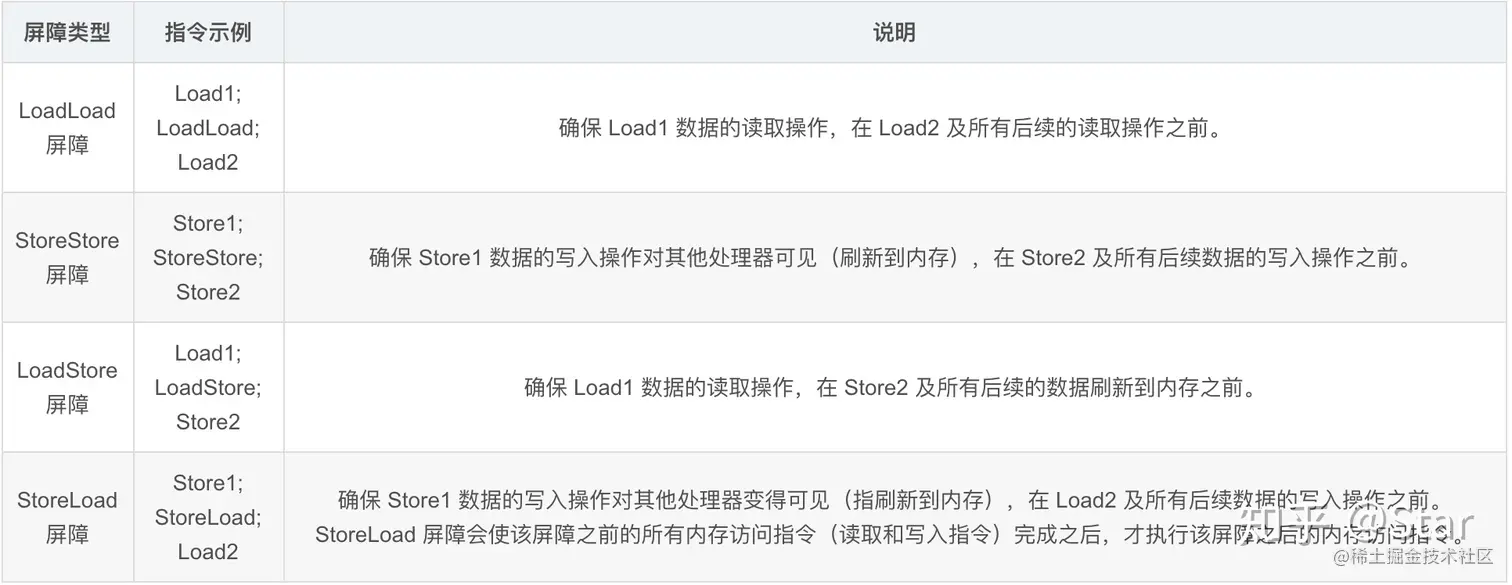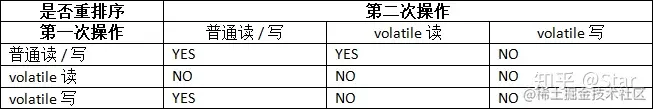 使用 volatile 修饰变量时,根据 volatile 重排序规则表,Java 编译器在生成字节码时,会在指令序列中插入内存屏障指令来禁止特定类型的处理器重排序。