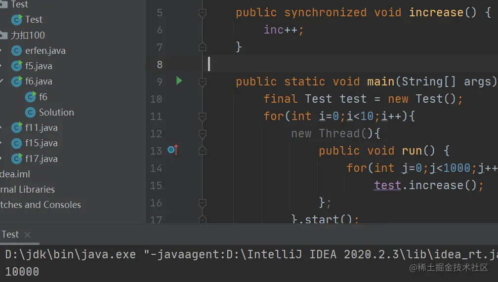为了得到正确的结果,此时我们可以将 race++ 使用 synchronized 来修饰,如下: