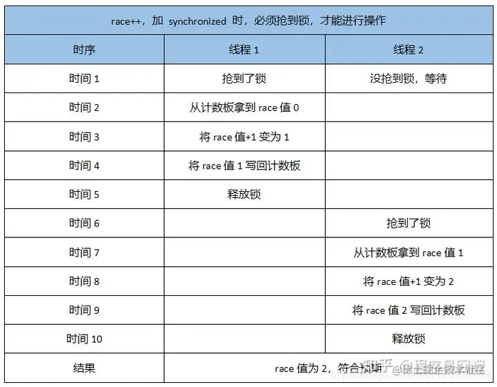 加了 synchronized 后,只有抢占到锁才能对 race 进行操作,此时的流程会变成如下:
